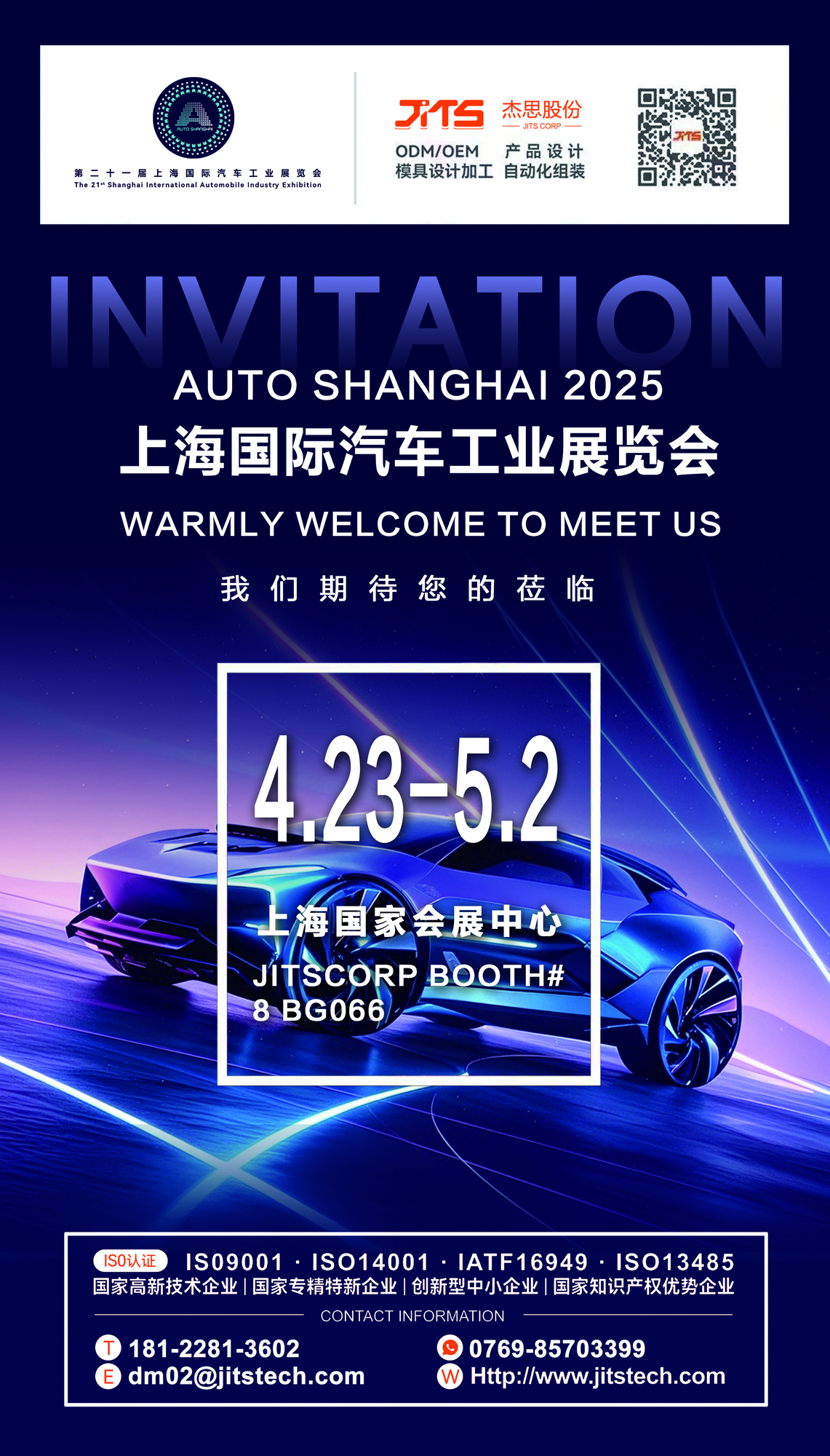 2025年4月23日至5月2日,上海國家會展中心將舉辦盛大的上海國際汽車工業展覽會。我們真誠地邀請您來到我們的展位8 BG066,并與我們討論!